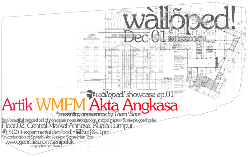 Walloped Showcase Episode 01 ~It’s a beautiful padded cell of non-cease noise strongroom, mood improv & ear-plugged pulse. ARTIK WMFM Tham+Boon AKTA ANGKASA December 01, 2007 RM12 | 8PM Floor.02, CM Annexe. Info: 012-248...