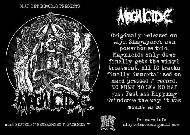 Magnicide’s only demo finally pressed on a 7″ – S$13 (local by hand), 7 Euro (rest of the world) + postage, email slapbetrecords at gmail dot com https://www.facebook.com/pages/Magnicide/153469081351311