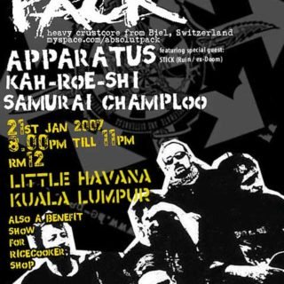 Note: Change of venue, Pack will be playing at Little Havana instead of CM. Details below.. The Ricecooker Shop Shitworkers presents! PACK with: Apparatus | Kah-Roe-Shi | Penang’s Samurai Champloo 8.00pm till 11pm RM12...